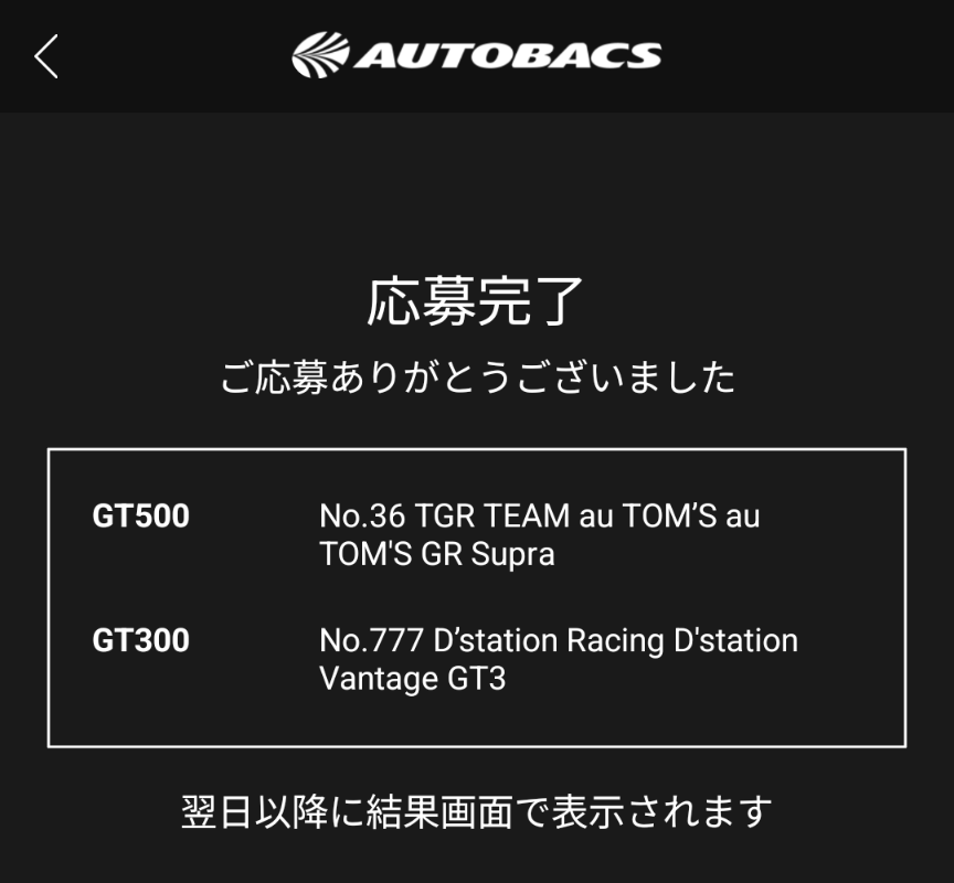 今年も開催されている、オートバックスアプリの、SUPER GT優勝予想キャンペーン。